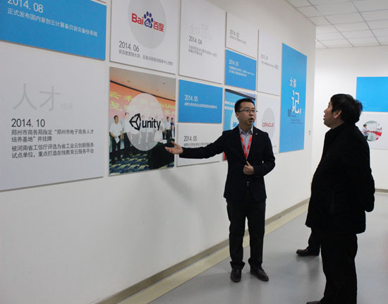 云和数据市场部总监姚宇向考察团领导一行介绍了云和数据公司的发展历程、业务模块以及发展规划,并陪同参观了云和数据办公区和学院区。云和数据公司自2013年成立以来,取得了飞速的发展,由最初的十余人,目前已经发展成为百人团队,并获得了“郑州市电子商务人才教育培训基地”、“中部游戏产业联盟高端人才培养基地”、“云和软件技术培训中心”、“百度营销大学授权培训中心”等多项殊荣。公司下辖三大事业部,云和学院、云和服务、云和游戏,三者形成了一个完美的生态链。